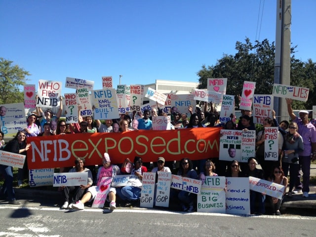 When the National Federation of Independent Business (NFIB) rolled into Orlando with its “I Built My Business” bus tour, they ran into some unexpected company – a crowd of 70 local business owners, community leaders, and Orlando voters who rejected the group’s claims to be a legitimate representative of small business. The protesters, some wearing Karl Rove masks, held signs proclaimed ‘NFIB Fibs,’ and ‘NFIB: Karl Rove Built It,’ referring to the $3.7 million support to the group from Rove’s Crossroads GPS.
